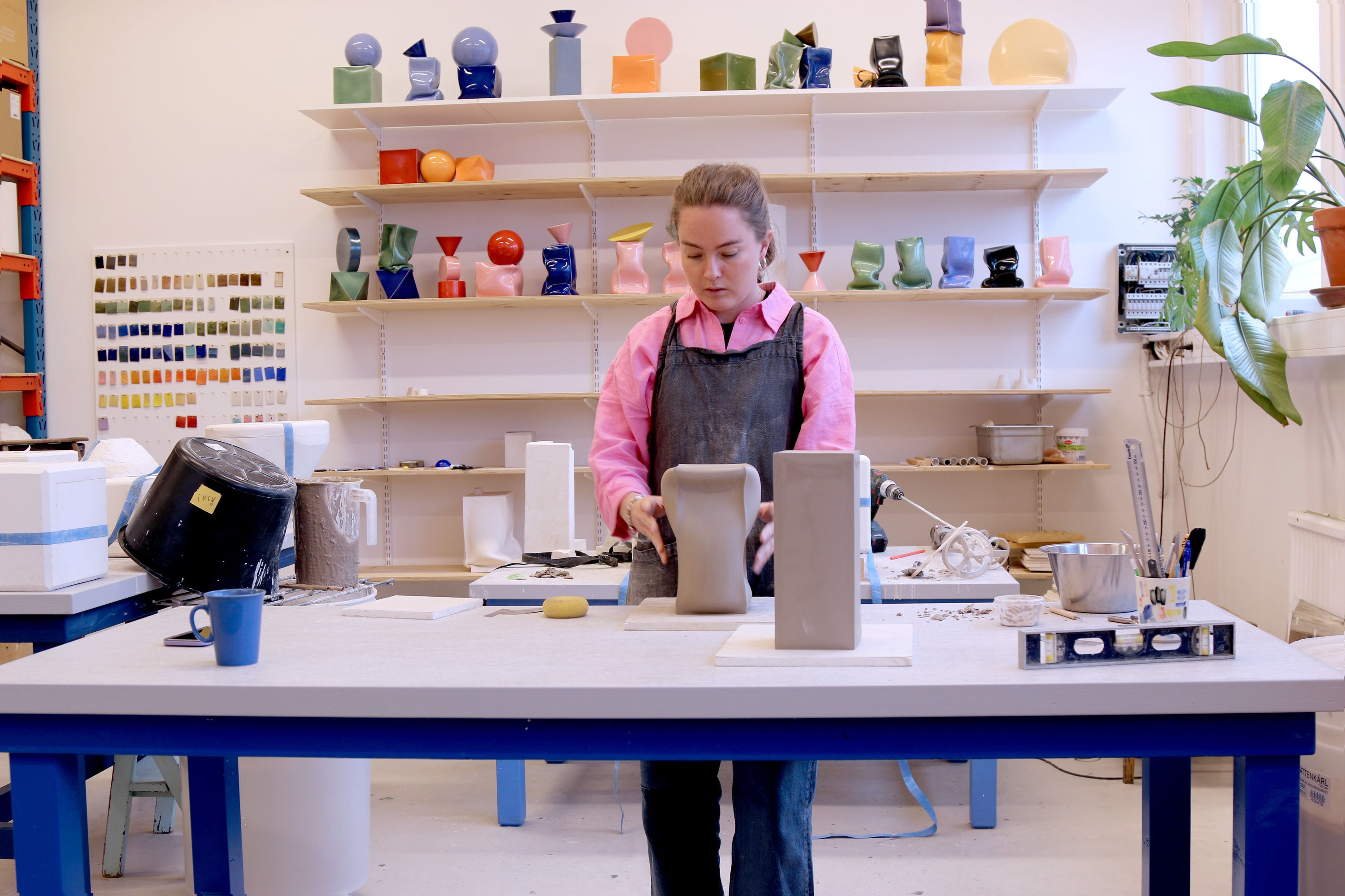 Åsa examines the basic geometric shapes in the ceramic process. She is working with casting techniques and exploring the primary forms, challenging the material, and pushing the clay norms to their edge. By relating to geometry, she defies herself to create these precise forms in ceramics. Åsa combines soft and colorful glazes on the surface with a strict body that juxtaposes each other. The artist plays with the equilibrium found between each form, while crating a harmoniously balanced sculpture.